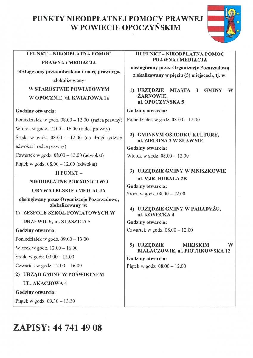 Miejsko-Gminny Osrodek Pomocy Społecznej w Drzewicy informuje, że od 1 stycznia 2025r. w powiecie opoczyńskim w dalszym ciągu funkcjonują trzy punkty tj. punkt I i III nieodpłatnej pomocy prawnej oraz punkt II nieodpłatnego poradnictwa obywatelskiego. W punktach II i III dodatkowo będą realizowane zadania z zakresu edukacji prawnej. W każdym punkcie jest także możliwość skorzystania z nieodpłatnej mediacji (po wcześniejszym ustaleniu terminu).
