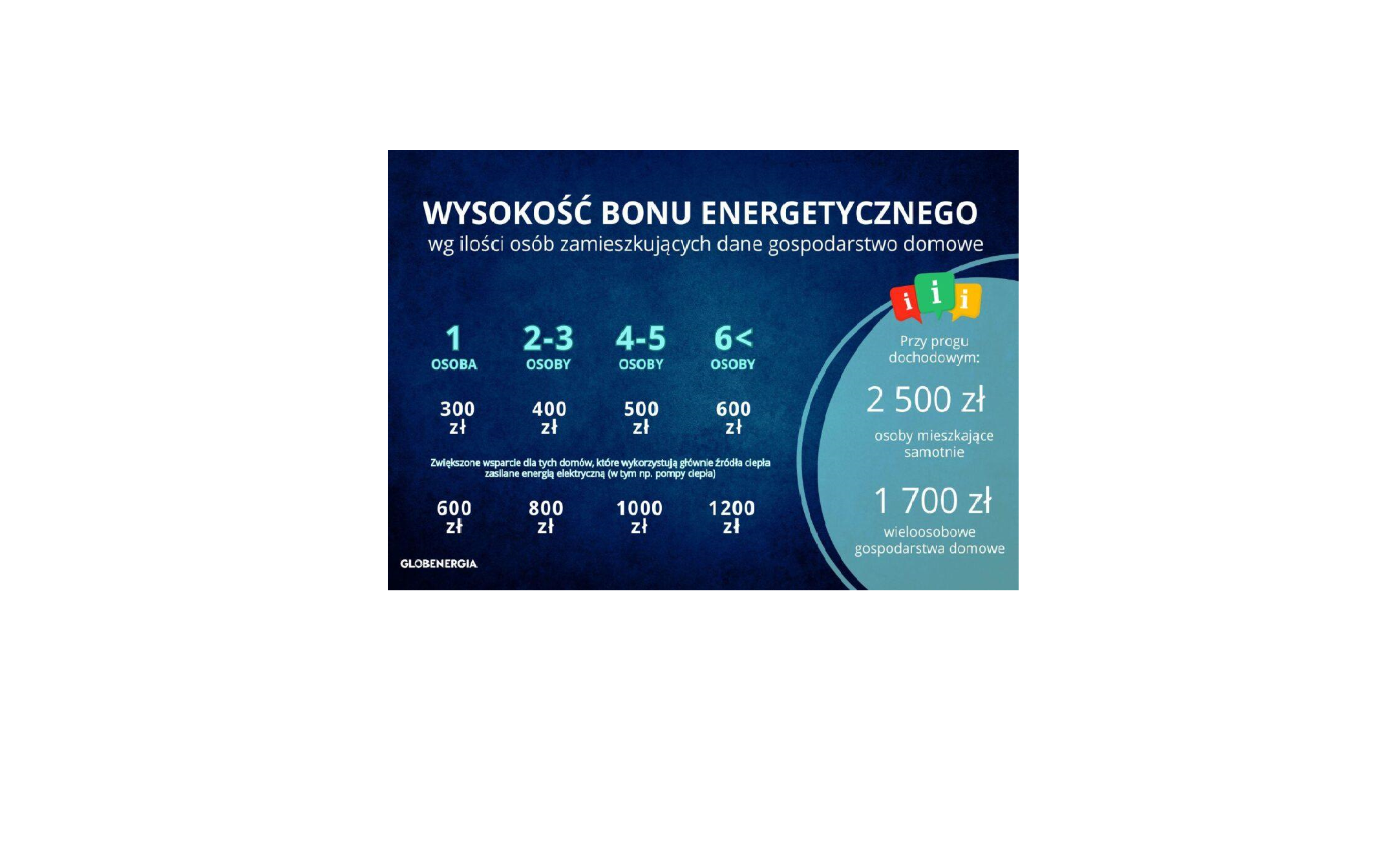 Zgodnie z ustawą o bonie energetycznym, bon energetyczny jest świadczeniem pieniężnym przysługującym jednorazowo gospodarstwu domowemu, którego przeciętne miesięczne dochody nie przekraczają 2500 zł miesięcznie w gospodarstwie jednoosobowym albo 1700 zł miesięcznie na osobę w gospodarstwie wieloosobowym.